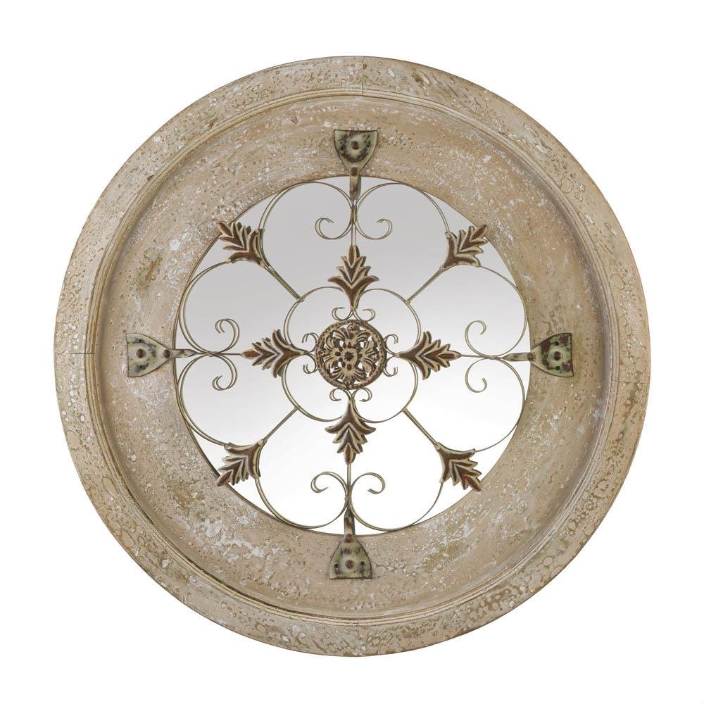 This one-of-a-kind round wall mirror exudes a country farmhouse feel. Features whitewash wood finish with an overlay of detailed metal embellishments to showcase the mirror beneath. Weight 7.6 pounds. 23.5" x 1" x 23.5". MDF Wood, Iron, Mirror. UPC Number: 849179040024.