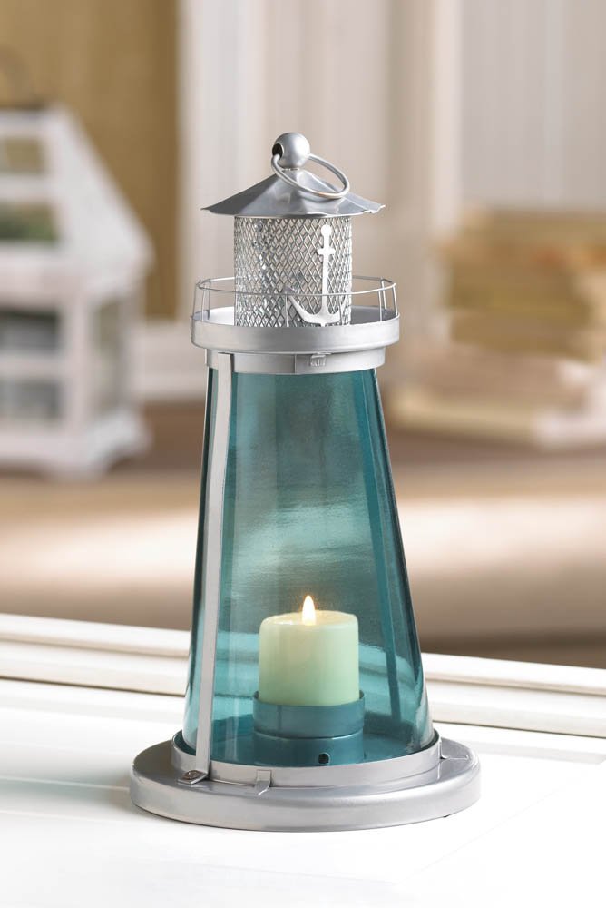 • This beacon will shine with blue glow when you light a candle of your choice inside. The tinted blue glass of this nautical lantern creates a seaside ambiance that is topped off by its shining metal watchtower frame. Set this lovely lantern on your tabletop or hang it from the loop on top.